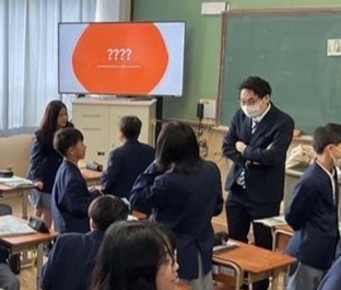 半分ほどの生徒が答えを知っている状況の中、その答えにまつわる内容を英文で相手に伝える活動を行いました。「It is an animal.」といった簡単な文を出発点に、知っている単語や表現を総動員しながら、懸命に英語で伝えようとする姿が見られました。