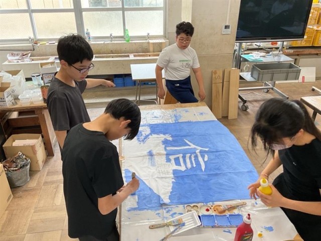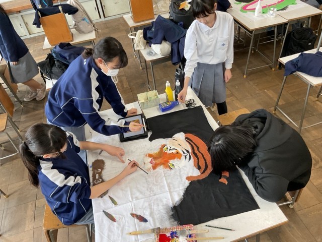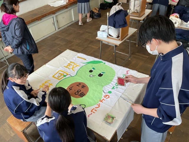 各クラスで決めた学級目標をもとに、学級旗を作成しています。クラスのみんなの思いを背に、筆を進めています。なかなか思うように描けない様子でしたが、思いは乗っかっていることでしょう。学級旗は各クラスで披露するだけでなく、生徒総会や伏中祭体育の部、3年生を送る会などで使用します。世界に一つだけの学級旗、完成が楽しみです。