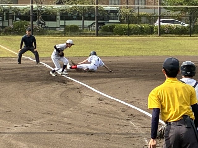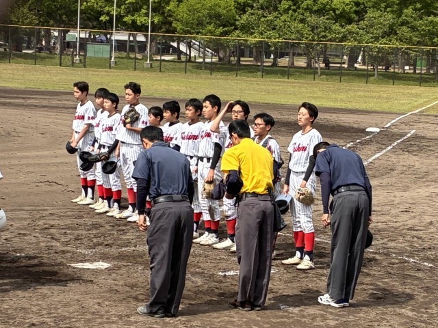 4/25(土)岡崎公園野球場にて、本校野球部は加茂川中学校と対戦しました。初回表の本校攻撃、打撃・走塁が光り1点を先制。その裏も立ち上がりから力強いピッチングで幸先よく初回を終えました。しかし相手校も2回以降じわじわと追い上げてきて、最後には惜敗となりました。入部したての1年生も、スタンドから声を張って応援していました。この悔しさを練習に込めて、夏にはさらに力をつけて戦ってくれることと思います。早朝から応援に駆けつけていただいた保護者の皆様、ありがとうございました。