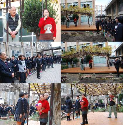 11月30日(木)昼休み,完成した中庭のウッドデッキのお披露目会が行われました。学校長挨拶,生徒会長からのお礼の言葉,そしてテープカット,花束贈呈…