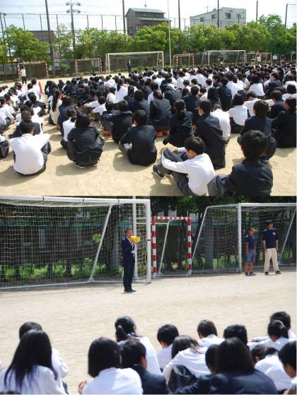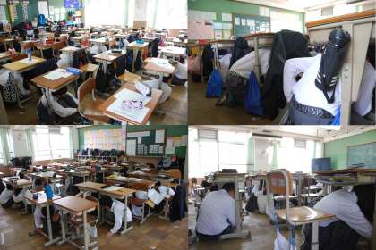 5月16日(水)5限,安全学活で避難訓練が行われました。教室で地震や火事の恐ろしさを知るとともに,家で準備しておくものや想定される困りごとなどをグループで話し合い,災害に備えての準備物や行動について学びました。地震発生の放送が鳴ると,机の下に移動して,安全確保をしました。また避難開始後,全校生徒1101人が一斉にグラウンドに移動して素早く整列する姿を見ることができました。目標5分に対して4分55秒で整列することができました。地震に対して意識を高めることができました。