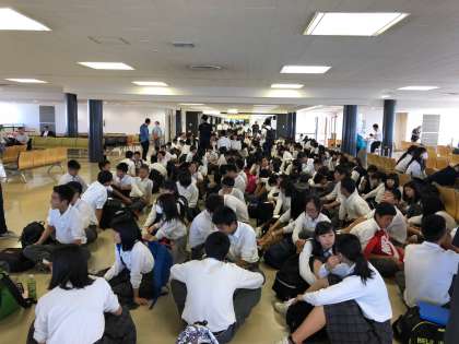 搭乗口に集合した様子です。8:40頃から搭乗して,9:10に出発しました。みんな飛行機を目の前に,期待と不安でいっぱいなようです。