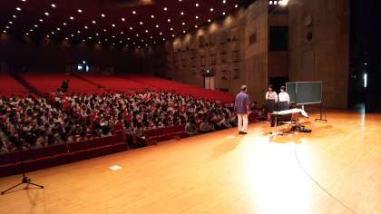 13:20分より平和講話が始まりました。真っすぐに前を向いて,真剣な表情で聞いていました。平和講和を聞き終えたあと,感謝の気持ちを生徒から伝え,最後に花束をお渡ししました。生徒たちの心に響いた平和学習になりました。現在は,バスで本部港に向かってます。バスの中ではレクレーションで盛り上がっています。