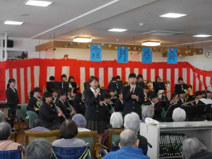 11月25日(日),京しみずの訪問演奏をさせていただきました。昭和の名曲を中心に演奏し,歌なども交えて演出もがんばっておりました。入所者の方々には演奏も楽しんでいただき,生徒たちは大変喜んでおりました。ご声援ありがとうございました。