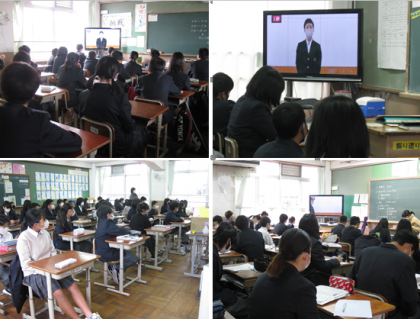 まずは,伝達表彰を行い,校長先生のお話,生徒会から,生徒指導部長のお話と続きました。生徒の皆さんは教室でしっかりと参加できていました。