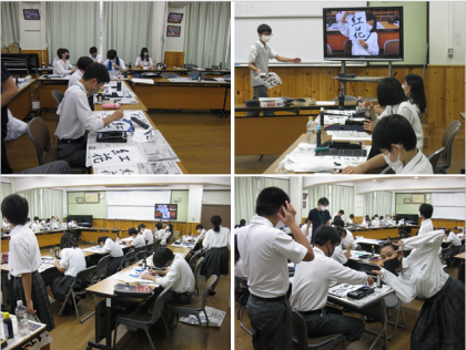 書写の授業の様子です。「紅花」の字を真剣に取り組んで書いています。
