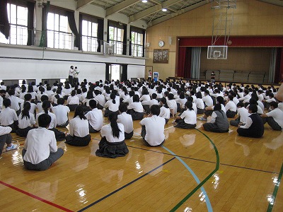 7月16日(金)の4限に,二年生が一学期のまとめの学年集会を行いました。各クラスの中央委員がクラスの様子の発表がありました。その後,先生方から夏休みについてのお話がありました。夏休みからは部活動の中心になる2年生。集会の様子からも落ち着きと頼もしさが伝わってきました。