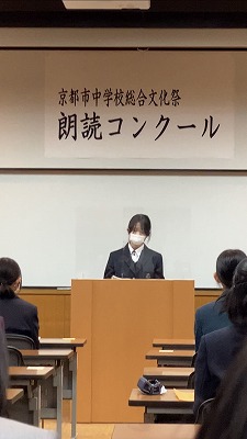 11月6日(金),京都市中学校総合文化祭で朗読コンクールが行われました。本校から放送部員が出場し,国語の教科書の一部を朗読しました。一言一言に気持ちを込め,素敵な朗読を行ってくれました。