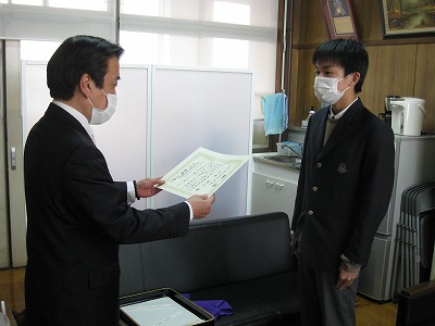 本日,全国納税貯蓄組合連合会及び国税庁が実施する中学生の税の作文に応募した中で,優秀な作文として3年生が表彰されました。伏見区税務署より表彰に来ていただき手渡していただきました。