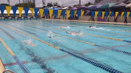 加茂川中学校のプールで水泳競技が行われています。