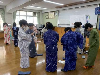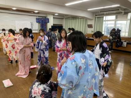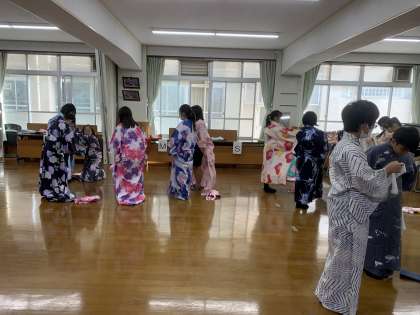 家庭科の授業で1年生が和装体験にチャレンジしています。講師の方をお招きし、色とりどりの浴衣に着替えました。