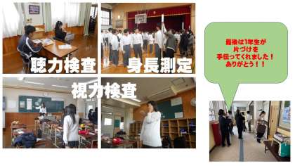 本日、全学年で春の発育測定を行いました。身長と体重の測定は体育館で、視力測定は教室で行いました。「先生、背が高くなってたよ!」と教えてくれた生徒もいてとても嬉しかったです。生徒の皆さんの成長のお話を聞くのが私たち教職員の楽しみです。次回は秋です。