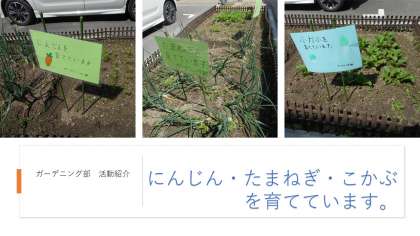 ガーデニング部はいつもきれいな植物を育ててくれて、学校を明るくしてくれています。そんなガーデニング部は現在、にんじん・たまねぎ・こかぶを育てています。写真のようにぐんぐん成長しています。収穫できる日が楽しみですね!!
