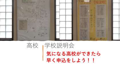 3年校舎入ってすぐのところに進路の掲示物があります。その掲示物には、学校説明会の日程等が載っています。特に3年生は行きたい高校ができれば説明会を通して高校に行きましょう。何より、自分の肌で高校を感じることが大切だと思います。