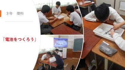 3年理科授業の見学をしました。「電池をつくろう」という授業でした。銅板と亜鉛版で電気が発生するしくみを学習していました。とてもきれいにオルゴールが鳴り、電気を発生させることに成功していました。様々な改良を経て、現代の電池があることがわかりましたね。今の私たちの生活において電気は無くてはならないものです。これからもずっとずっと電気を使った生活ができるように、学びを深めていってください。