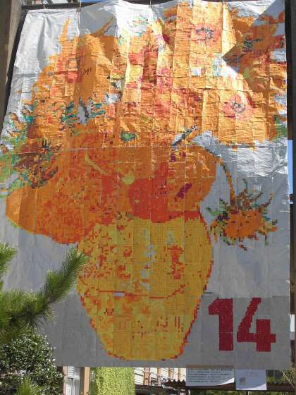 絵画・書写作品の展示と「さおり織り」。共同作品「ひまわり」 14組の美術と書写の授業でできた絵画作品と書写作品を展示します。また、渡り廊下には大きなはり絵を展示しました。今年は「ゴッホのひまわり」に取り組みました。「さおり織り」の体験もしました。