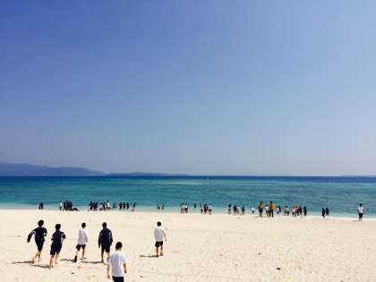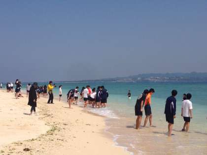 午後3時からの「全体レクレーション」に向けて、生徒たちが続々と「伊江ビーチ」に集まってきています。