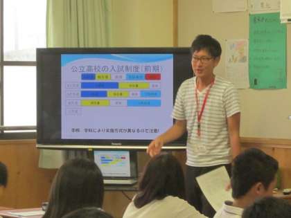 公立高校の選抜制度については、おもに前期選抜と中期選抜の内容について、パワーポイントを用いて説明がありました。私立高校では、おもに推薦・専願・一般の選抜制度の違いについての説明がありました。