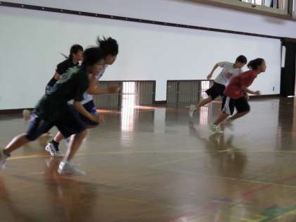 7月7日〈火)放課後、雨上がりの蒸し暑い体育館で、女子バスケットボール部は一生懸命基本練習に取り組んでいます。今年のチームは3年生4名、2年生10名、1年生5名、合計19名と男子と比べると少ないですが、一つ一つの練習を手を抜くことなく丁寧に全員が頑張って、まとまって練習に取り組んでいます。キャプテンは「夏季大会の目標はベスト4に入ることです。今年のチームは3年生の人数が少ないのですが、その分2年生との学年の隔たりもなく全員がひとまとまりになって頑張れます。声も大きく出るし元気もあります。試合では2人のポストを軸に全員で走って、持ってる力を発揮したいです。」と自信をもって話していました。