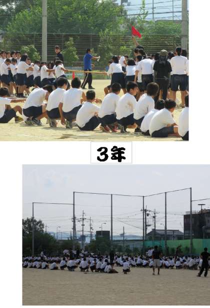 9月15日〈火)体育の部の学年練習2日目です。1年生「いかだ流し」2年生「大縄跳び」3年生「綱引き」どの学年のどのクラスもまとまりがでてきて、勝負が均衡しています。