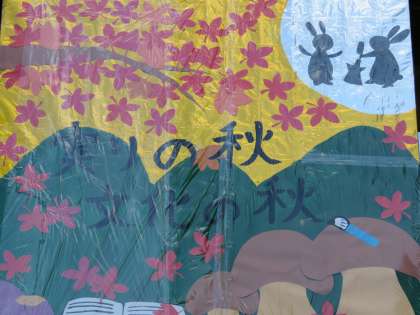校門を入った正面の2階渡り廊下には、文化委員が作成した「実りの秋 文化の秋」の作品が展示してあります。紅葉に月に松茸に読書、秋の風景です。