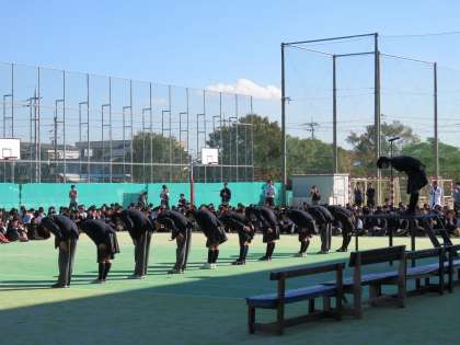 11月5日(木)5限、オムニコートに全校生徒が集まり、生徒会本部役員の認証式が行われました。第38期生徒会本部役員から任期を終えて最後の話があり、その後新生徒会長に生徒会旗が手渡されました。第39期生徒会本部役員たちはいきいきとした顔つきをしていました。