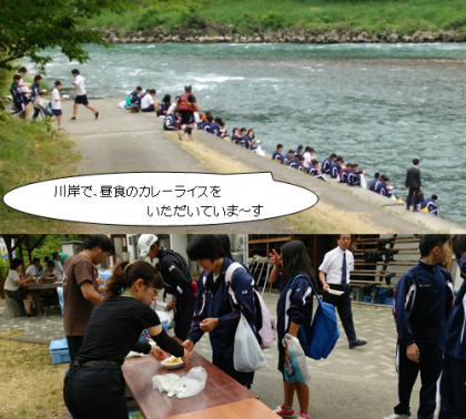 川岸で昼食のカレーライスをいただいています。大自然の中で食べるカレーライスは格別です。
