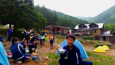 7月25日(月)ワンダーフォーゲル部は夏合宿の初日です。午後4時、赤岳鉱泉にて夕食の準備中です。部員19名全員が無事に到着しました。みんな元気いっぱいです。