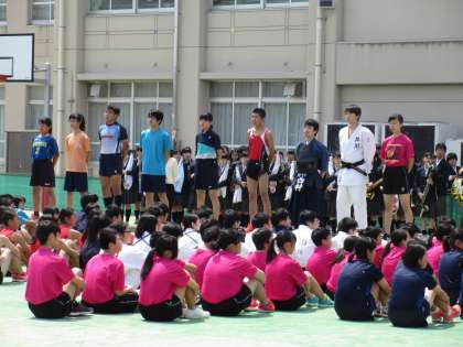 青空のもと、爽やかな神川中学校の生徒たちが吹奏楽部の演奏に乗って、力強く行進をして入場。各部のキャプテンが試合への意気込みを熱く語りました。高岡校長先生からは、勝敗も大切だが、最後まであきらめず一生懸命競技してほしいと激励