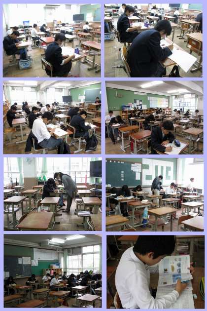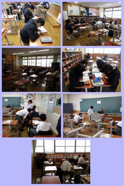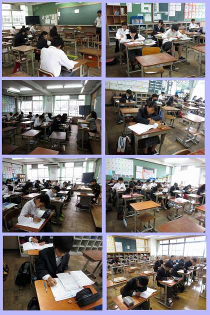 激しく雨が降りしきる中、1年生82名、2年生63名、3年生40名が登校し、熱心に学習に取り組みました。自学自習クラスでは、黙々と取り組む姿が、質問クラスでは熱心に先生から教えてもらう姿が見られ、とてもいい雰囲気で土曜学習会が行われました。26人の先生方も生徒の姿を見て嬉しそうでした。