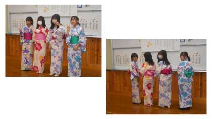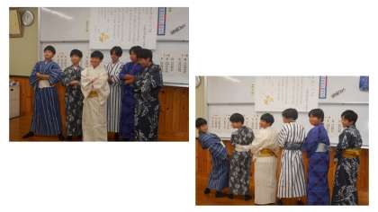 1年家庭科の「和装体験」が始まりました。難しいなと言いながら、仲間と協力して和装を着ていました。和装を着た姿はとても似合っていました。