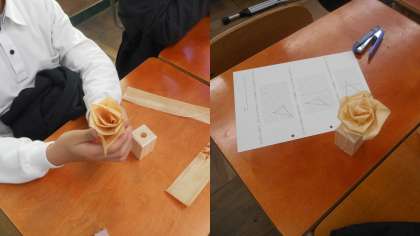1年総合的な学習の時間にかわな工業様に来校していただき、授業をしてもらいました。今1年生は次年度の『チャレンジ体験』に向けて職業調べをおこなっています。その一環として今週と来週に木工職人の方に来ていただきその仕事の紹介や仕事をするために何が必要かを教えていただきました。実技を伴った授業展開をしてもらえたので、生徒も興味をもって学習に取り組んでいました。