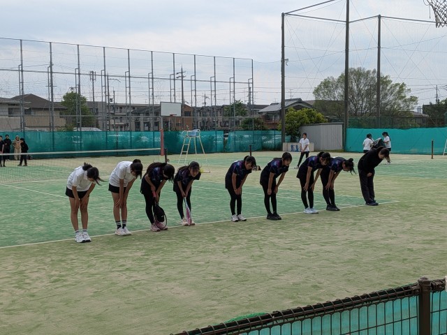 4/29(水)女子ソフトテニス部団体戦、試合後に応援席に向かってあいさつをしている様子です。チーム一丸となって大きな声で応援し、がんばっていましたね。