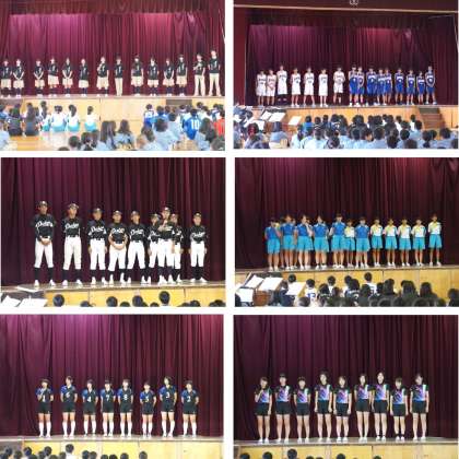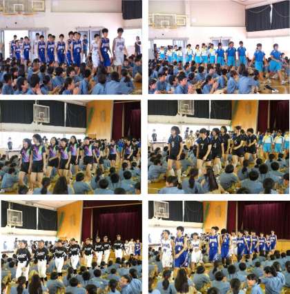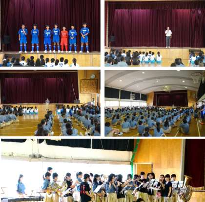 夏季大会に出場する各部活動の生徒が、吹奏楽部の演奏で体育館に入場し、部活動ごとにステージに上がり、夏季大会に向けての決意表明をしました。