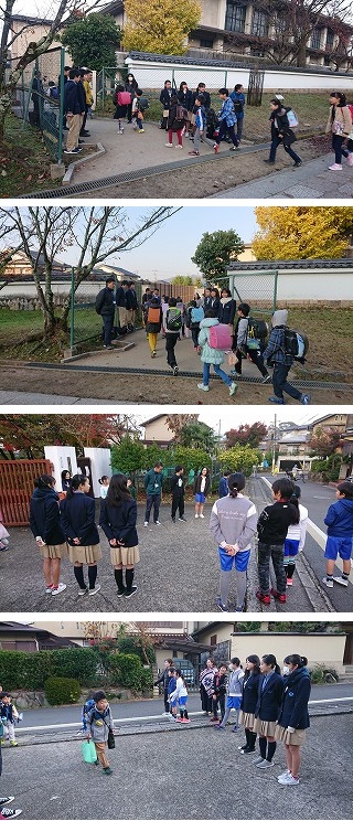 醍醐中学校と校下2小学校の生徒・児童の代表が一緒に挨拶運動を行いました。醍醐中学校の生徒が,それぞれの小学校へ行き,登校する児童に「おはようございます」と声かけを行いました。