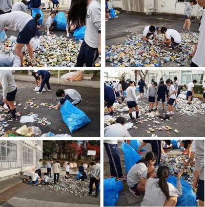 地域の皆様の協力で集まっていた空き缶を,全校生徒が踏んで小さくし,200個ずつ袋に入れて整理しました。