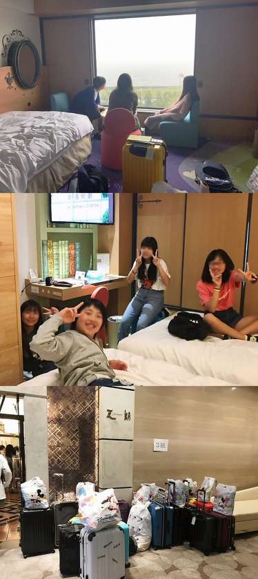 みんなの荷物はディズニーのおみやげで膨らんでいて、昨日の楽しかった夢のひと時が伝わってきます。