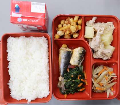 給食は「節分」にちなんで、京都府舞鶴産の鰯(いわし)を使った「鰯(いわし)の変わり煮」と「カリカリ大豆」が入った「節分献立」でした。