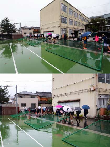 風で飛ばされやすい物は校舎内に入れ,倒れそうな物ははじめから倒しておきます。