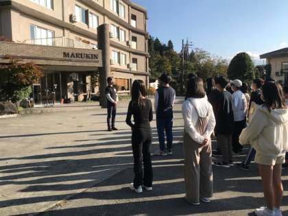退館式です。お世話になった旅館の方にお礼をしました。オーナーさんからは、「コロナ禍で今まで当たり前と思っていたことが、実はそうではなかったことがわかりました。修学旅行も同様です。修学旅行に行けない学校がある中、皆さんは修学旅行に行けました。そのことに感謝して、これからの学校生活を送ってください。」という言葉をいただきました。