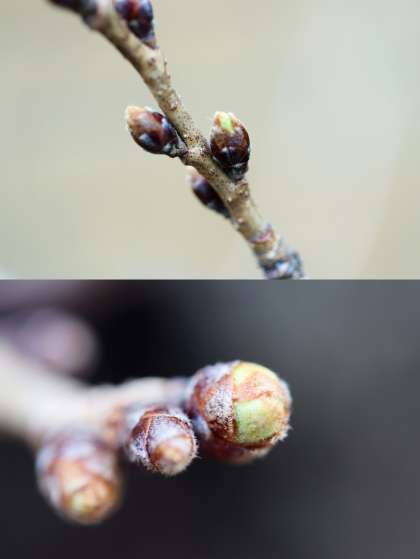 茶色の皮の間から緑色の花芽が顔を出してきました。