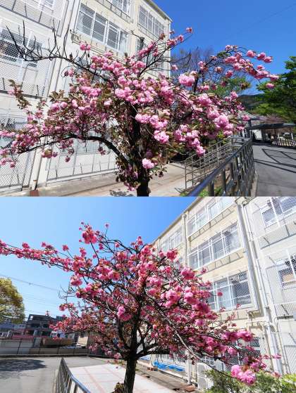 校内のソメイヨシノはピークを過ぎてしまいましたが、西校舎前の八重桜が満開です。