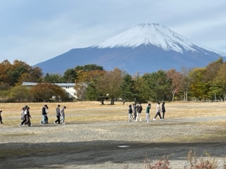富士山をバックに早速、ペンションでのことを先生達に話してくれています。