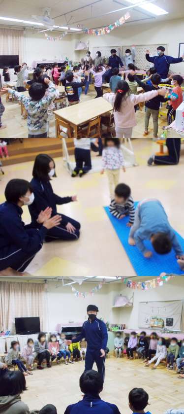 「ふれあい体験(保育実習)」2回目です。1・2限に、3年3組が校区内の「端山の丘こども園」でお世話になりました。