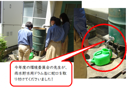 雨水を貯めているドラム缶に、環境委員会担当の先生が蛇口を取り付けてくださったので、使い勝手がとても良くなっています。
