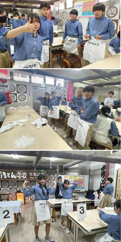 うどん学校へ到着し、早速エプロンを取り付けました。