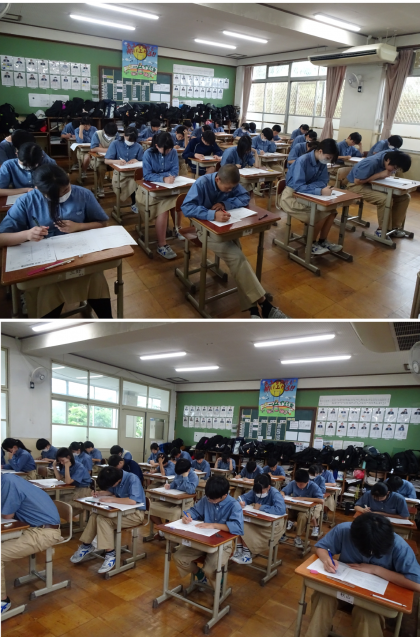 昨日から暑いこの期間は体操服での登校が認められたところではありますが、来年の高校入試を想定して今日は標準服(制服)を着用してテストに挑んでもいます。
