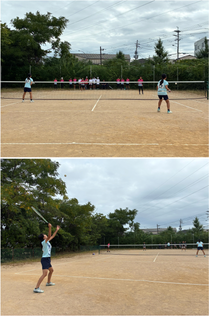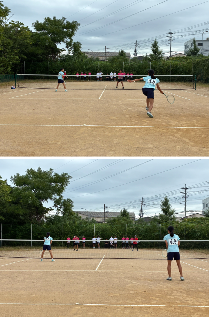 初戦は樫原中学校と対戦し、積極的に攻撃を仕掛け、サーブやストロークでポイントを決めていました。