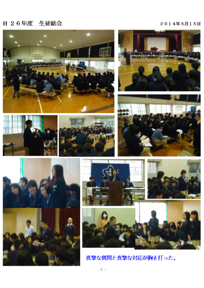 5月15日に5,6限を使って生徒総会が行われた。見ていて何とすばらしい子どもたちだろうと思った。逐一報告はできないが、生徒会長の森田君が「醍醐中学校のいいところ3つ、課題を3つ言います。」と切り出した。「そこから、次の提案をしていきたい。」 何と言うのだろうと思っていると。