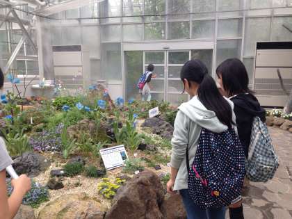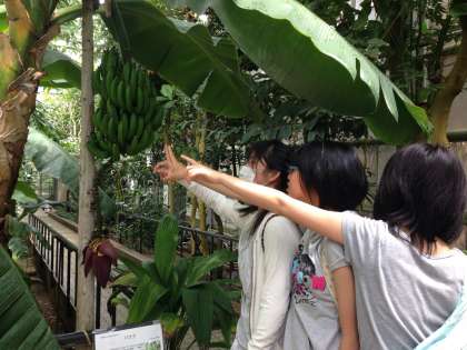 ここは園内の温室です。珍しい熱帯の植物を見ることができます。おっと、そのバナナは観賞用ですよ。誰ですか、美味しそうって言ってるのは。あれれ、両手で目隠しという謎の行動をとっている醍醐中学校の1年生発見。それ、何のおまじない??